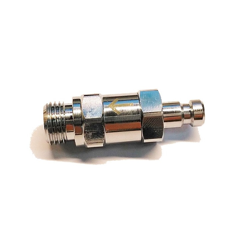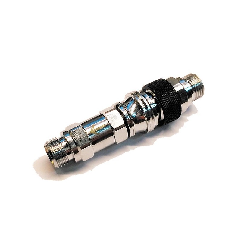The female part is similar to the ends of the standard inflation hoses, but with much robustness and much more gas flow, the needed for a great diver demand. It has a screw dial part that allows us to block the connection, while blocked it has not possible to disconnect. The hose connection is male 9/16 " (standard regulator hose)