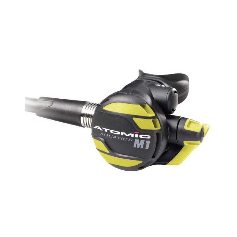 Octo. with 36" hose. Built on the same platform as the Ti2 and Z1, the M1 has some unique features that make it the choice for certain extended range applications. The M1 second stage is factory rated for oxygen-enriched mixtures up to 80%. The front cover is unique in that there are no openings in front of the cover. This helps prevent the regulator from turning on if subjected to wave surge or strong currents. The demand valve body is Zirconium plated brass for fast thermal transfer with a heat sink feature to reduce the possibility of freezing in cold water. The critical metal components of the demand valve (lever, orifice and spring) are all made of titanium and are completely corrosion proof. Like all Atomic regulators, the M1 has the AFC automatic flow control, Seat Saving Orifice valve design and manual override knob to reduce regulator sensitivity during entries or exits.