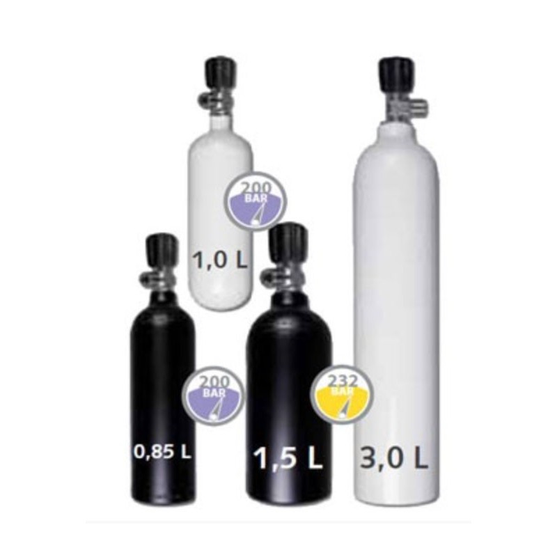 There are 4 different types of bottles for installing the dry suit inflation system 1 liter steel and aluminum three of 0.85, 1.5 and 3lts