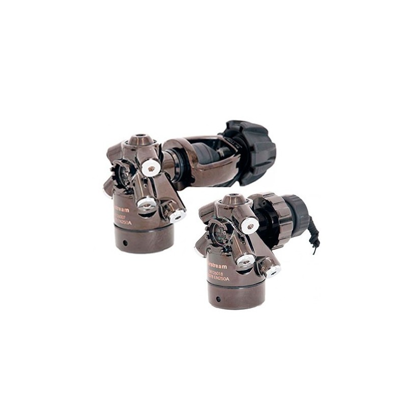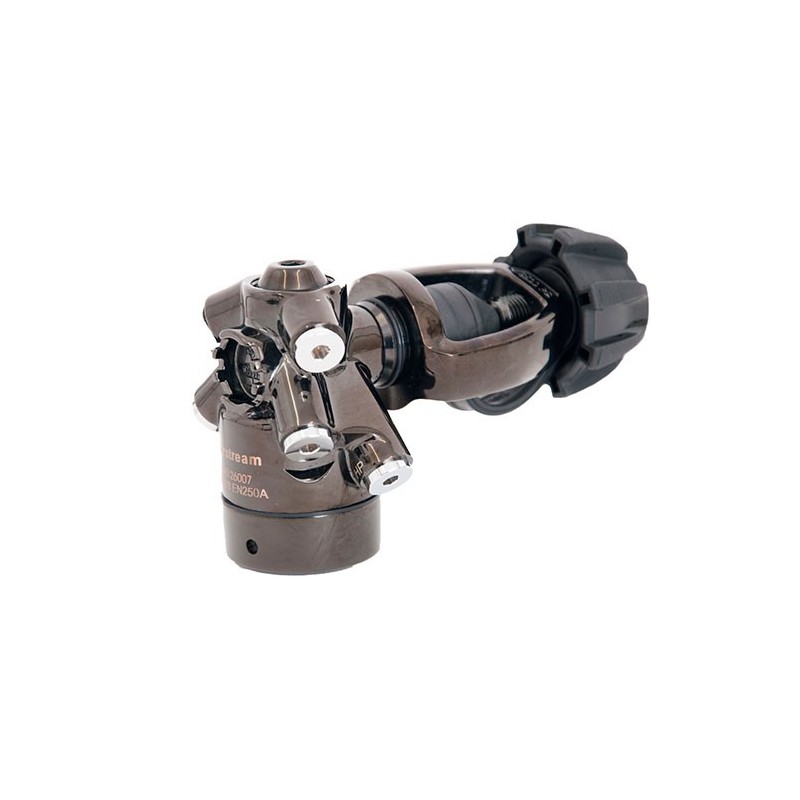 The Airstream Overbalanced and Environmentally sealed first stage is made through a forging process allowing optimized hose routing. The low pressure ports are angled 30 degrees down and 23 degrees out to allow hose routing directly over the shoulders. The high pressure ports are angled down 45 degrees to keep gauges closer to the divers hip and body.