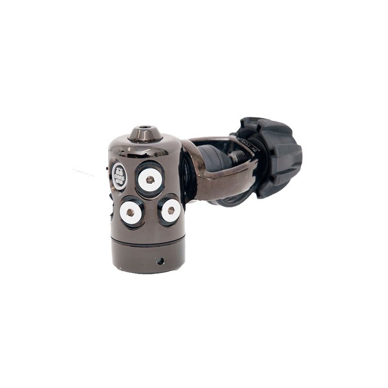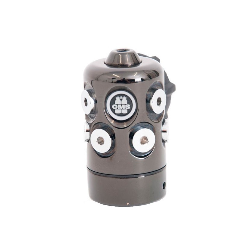 The OMS high performance AirStream first stage regulator now comes in a new Compact version. This first stage is made using a CNC machining process and is finshed in PVD! PVD stands for physical vapor deposition, a process used to create the highest durability, most tarnish and corrosion resistance possible today! It is a tower version, environmentally sealed, and has 4 Low Pressure ports and 2 High Pressure ports. Available in DIN and Yoke connections.