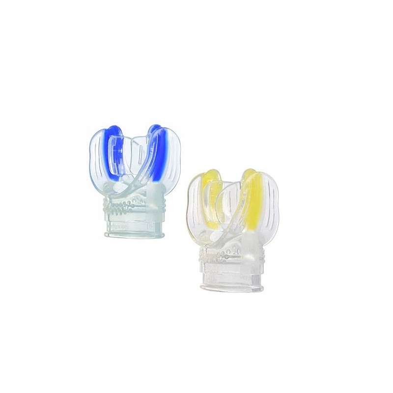 Lateral channels give the flexibility for a better fit into the particular morphology of the mouth. The spheres at the top and bottom stimulate the lips, relaxing them while making them assume the ideal position. This mouthpiece fits all Mares regulators.