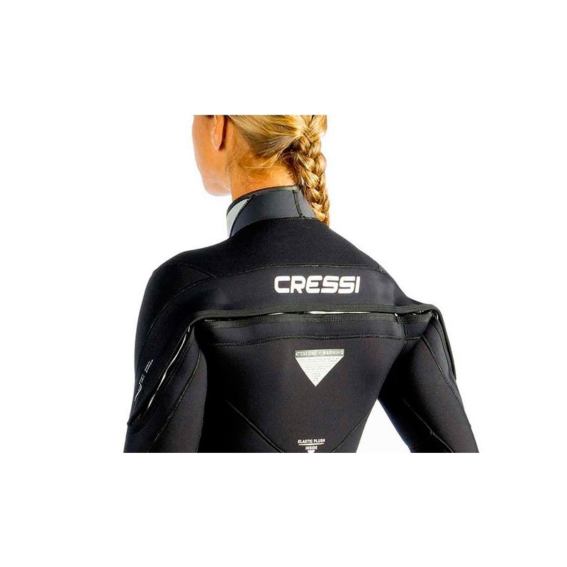 The back zip is in special marine bronze and runs from shoulder to shoulder with a protective zip cover. The position of the zip has been moved upwards and aligned with the arms to allow greater freedom of movement. This area is made in extremely supple Ultraspan neoprene to further increase comfort.
