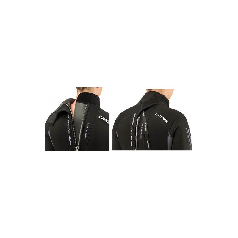 The closure of the wetsuit presents a noticeable improvement of the design that reduces the entry of water at this critical point. The closure flap is now much wider and the nape area is prolonged to prevent infiltration when the neck is tilted underwater.