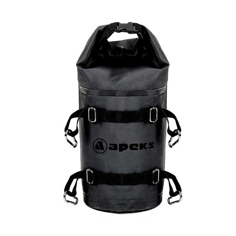 The four stainless steel karabiners on the DRY12 latch to the four stainless steel D-rings over the Apeks logo on the side of the DRY100. When attached, the waterproof roll-top opening on the DRY12 is conveniently located and easily accessible.