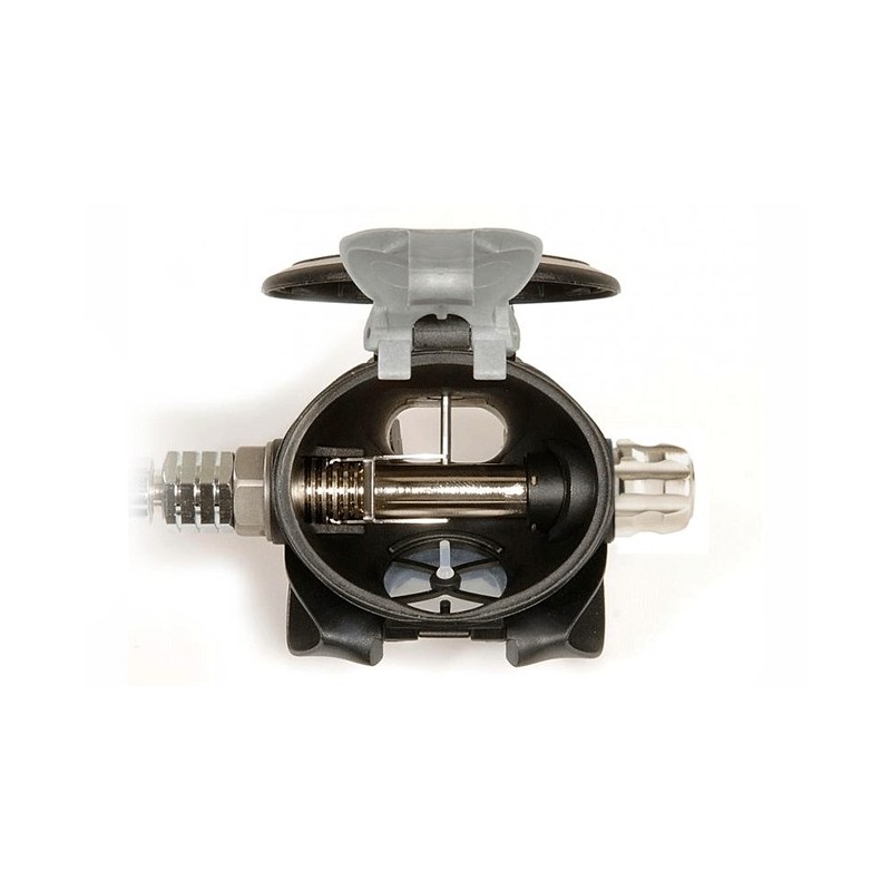 Pomo de microrregulación de esfuerzo inspiratorio sobredimensionado en titanio, con mecanismo de regulación completamente aislado del medio externo mediante doble tórica: garantiza la suavidad y durabilidad. El pomo incluye una tuerca para la regulación fina del esfuerzo respiratorio (servicio técnico).