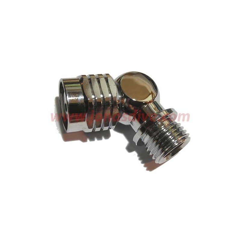 Codo fijo de 110º de angulación con conexiones 9/16" hembra/macho (para interponer entre la entrada a segunda etapa reagulador y el latiguillo)