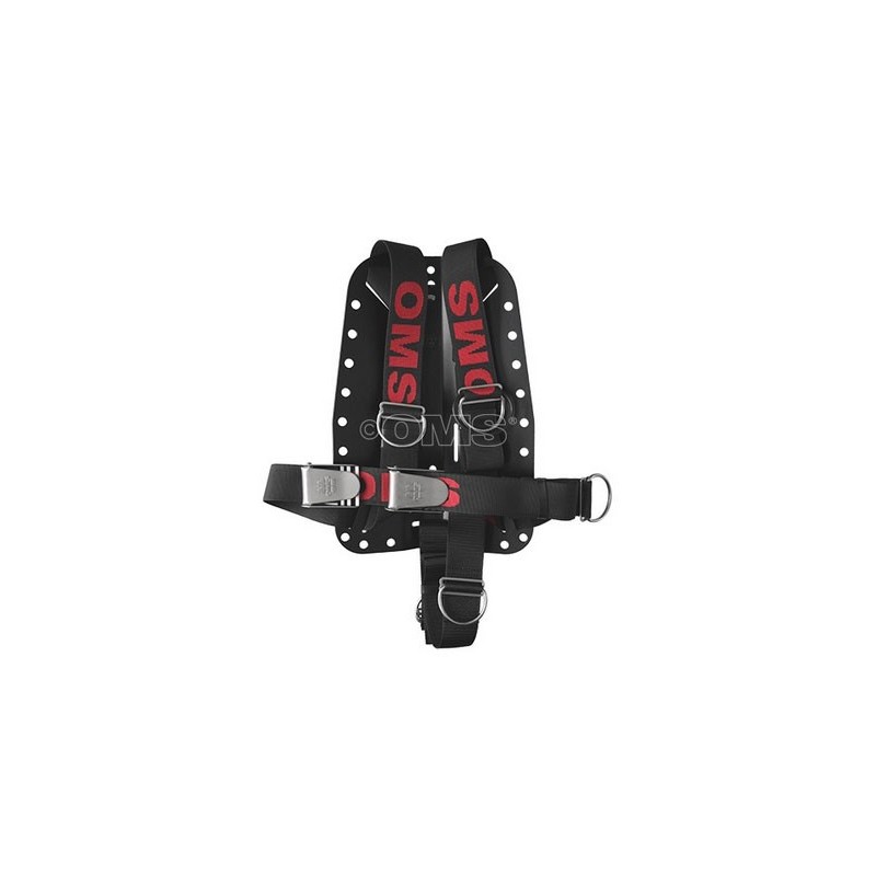 Arnés clásico tipo DIR, cincha de Nylon de 5cm de ancho, tres anillas del tipo D-Ring con sus correspondientes retenedores, dos al pecho y una a la izquierda.