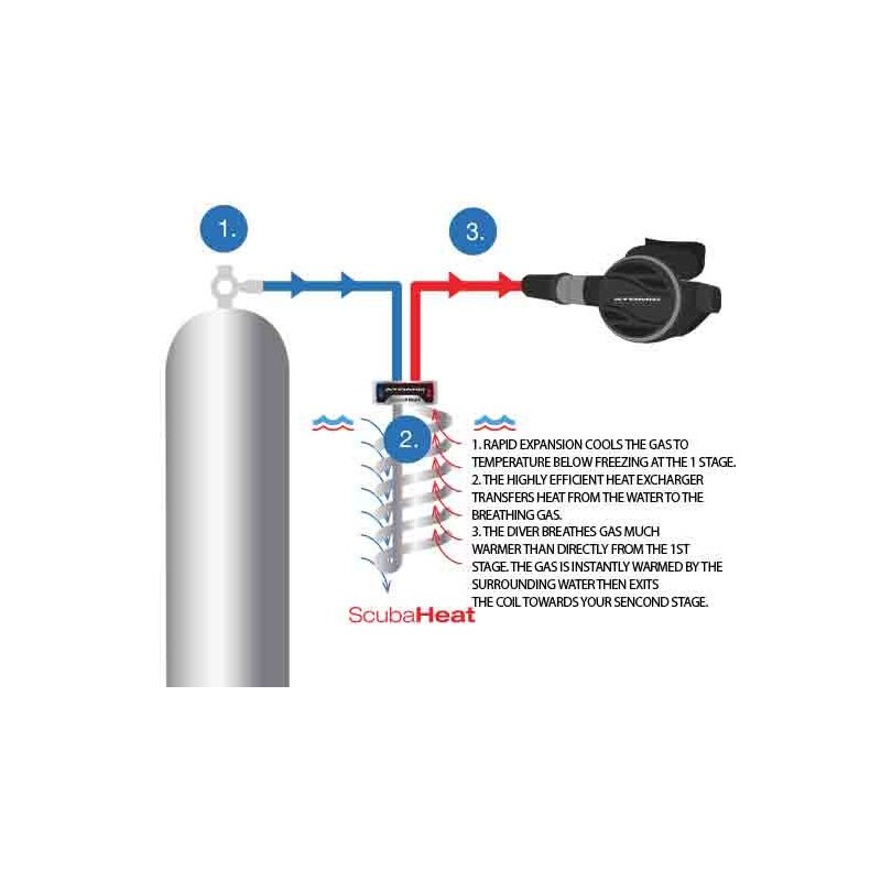 El gas al despresurizarse se enfría drasticamente, consecuentemente y mas si cabe en aguas frías, el gas nos llega a mucha mas baja temperatura que la ambiente. Atomic Aquatics ha desarrollado esta espiral de manera que el gas no sale directo de la botella a las segundas etapas, pasandop por la espiral y aumentando unos notables grados su temperatura.