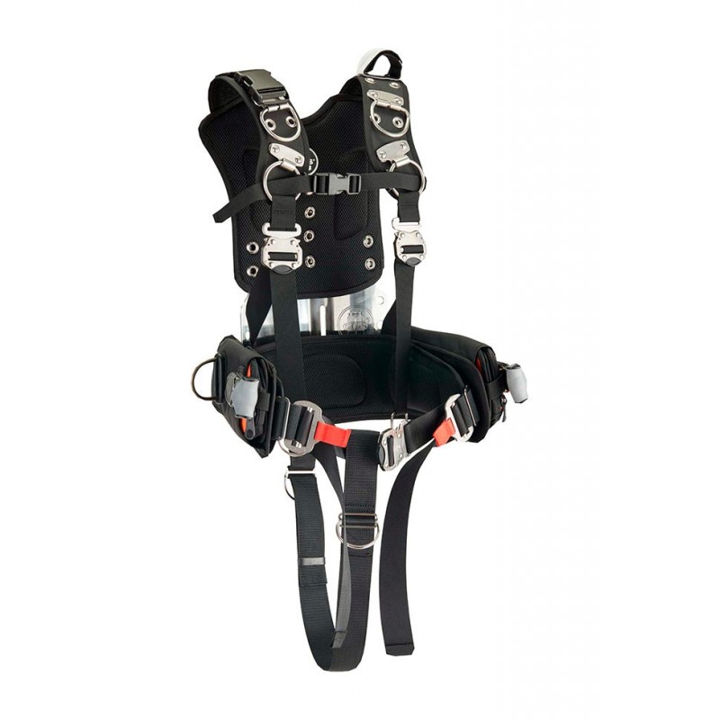 El equipo está formado por un arnés ajustable del tipo OMS Confort III, bolsillos porta lastre, backplate de acero específico, fajín de ajuste, hombreras extra resistentes y todos los elementos visibles en la foto que le confieren al equipo una dureza y resistencia sin igual.
