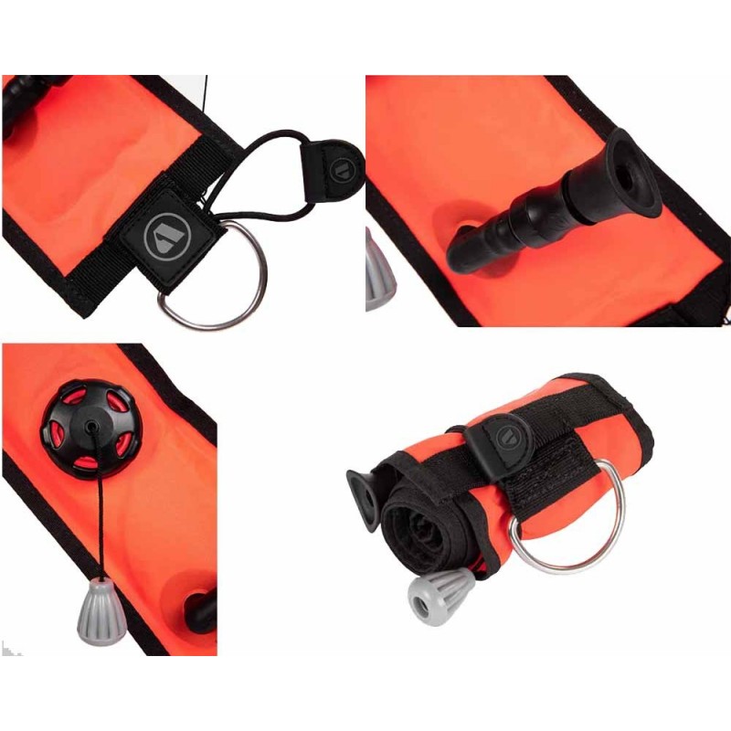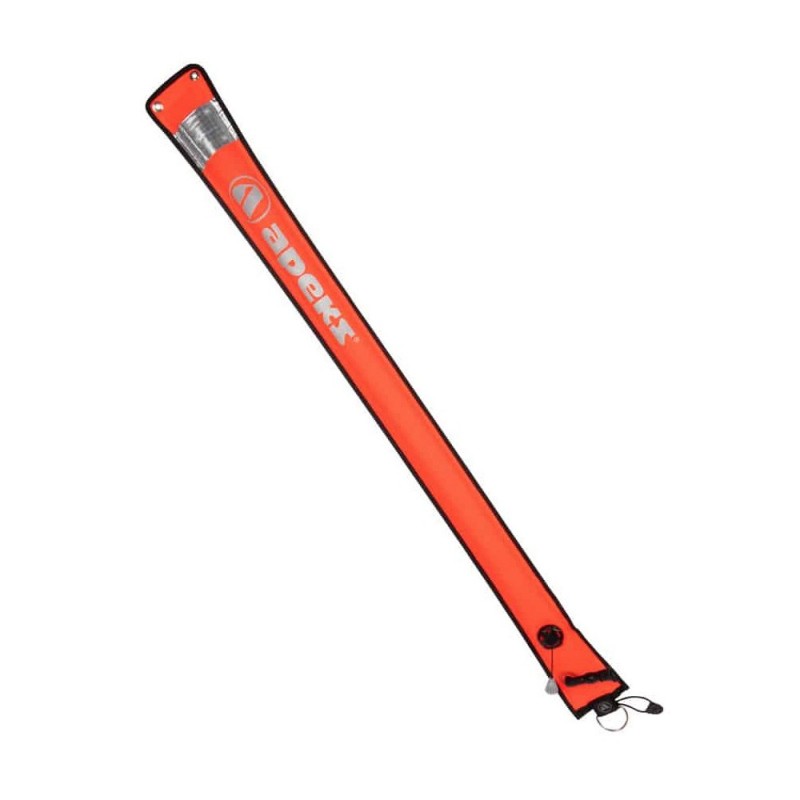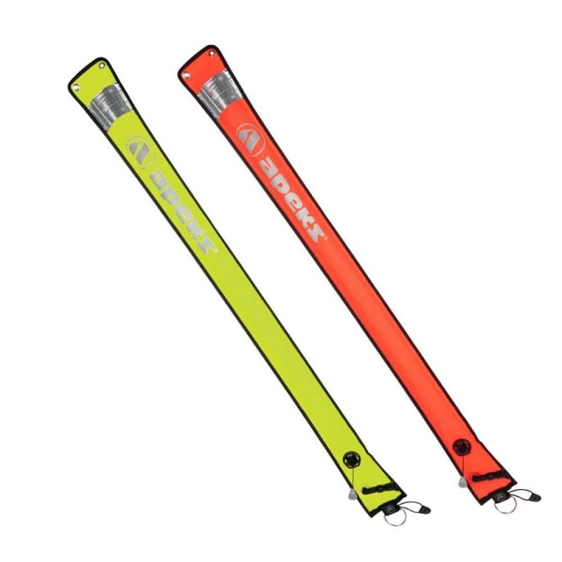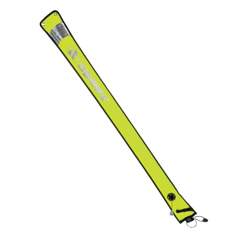 La boya Apeks no es solo la boya de señalización de superficie, sino que se puede usar también como flotador de emergencia. Tiene ojales de latón en ambos extremos para permitir al buceador plegarla y asegurarla en el aro flatante utilizando un mosquetón.