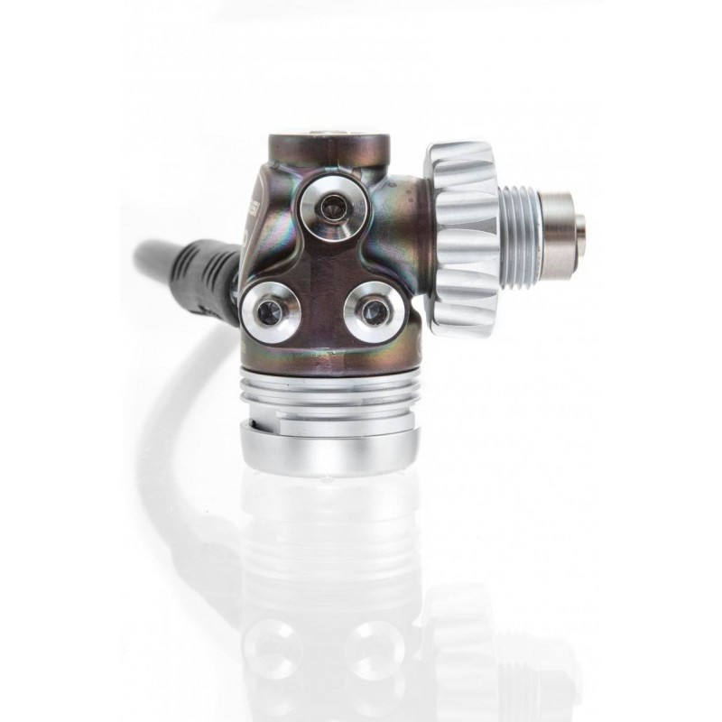 La configuración en T permite una mayor integración de la primera etapa en el perfil de la grifería y, por tanto, mayor libertad de movimiento de la cabeza del buceador. El mecanismo funciona transversalmente a la entrada de aire y la posible filtración de partículas procedentes de la botella que consigan sobrepasar el filtro no incide directamente en la válvula.