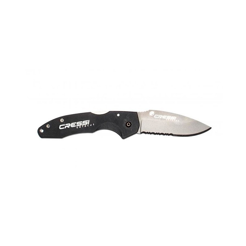 Cuchillo formato navaja de proporciones medias con hoja en Titaniomacizo de alta dureza y capacidad de corte y extraordinaria resistencia a la oxidación.