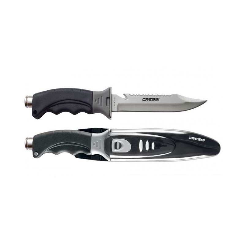 La hoja está confeccionada en un especial acero inoxidable templado, con un lado de filo liso y otro de filo dentado. Este lado de la hoja termina, próximo a la empuñadura, con una cavidad para cortar redes e hilos de pesca.