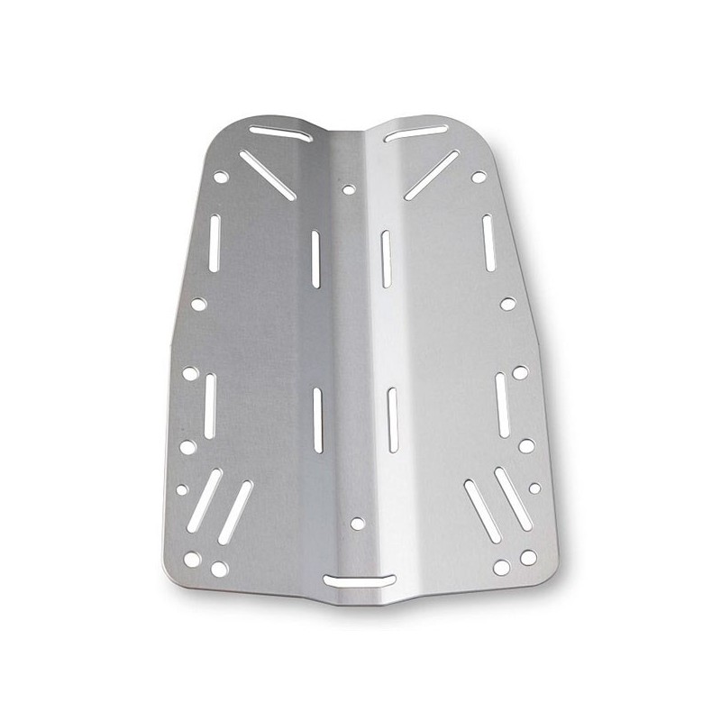 Placa posterior de acero inoxidable 316L de grado maarino, de 3 mm de grosor y 2,2Kg de peso. Bordes biselados en un cortador de NC, rectificado fino manualmente para un perfecto aplanamiento de las curvas pronunciadas, las cuales podrían dañar la cincha del arnés.
