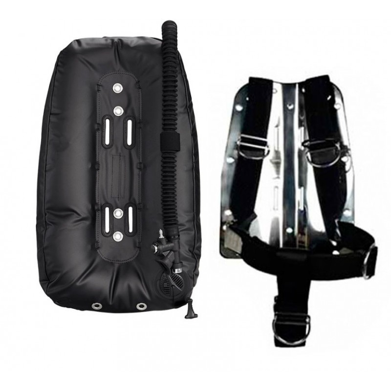 Arnés compuesto por 4mts de cincha continua, 5 anillas del tipo D-Ring DTD, 8 retenedores DTD, cierre cinto, cincha de entrepierna y un retenedor plástico para anclar en el hombro izquierdo y montar una goma tipo bungee a modo de sujeción de la tráquea del ala.