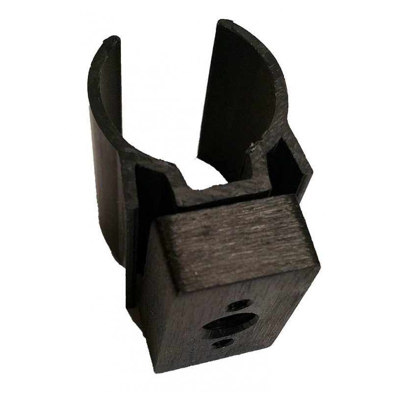 Se compone de la propia abrazadera en material plástico adaptable a distintos diámetros y una base de aluminio con entrada hembra para un espárrago estándar M8.