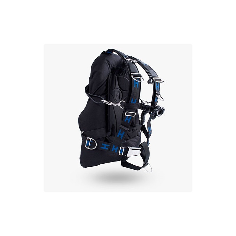 El Halcyon Zero Gravity cuenta con un arnés ajustable, anillas D fijas, un porta lastre opcional que soporta hasta 7kg y la opción de montar el inflador en el lado derecho.