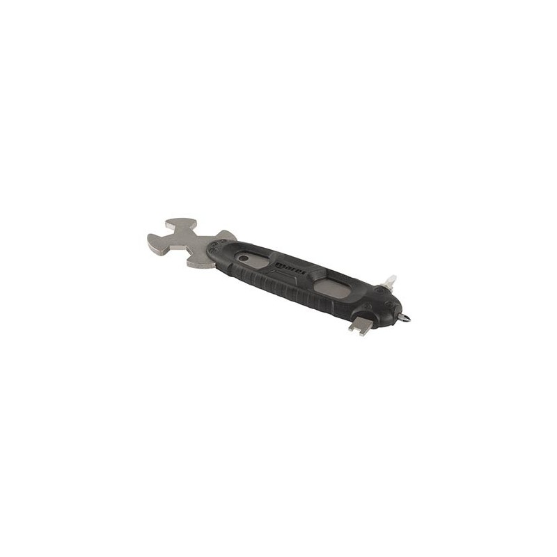 Herramienta múltiple con diferentes tamaños de llave, todo en uno. Perfecto para poder cubrir las principales medidas de llave fija que se encuentran en nuestro equipo de buceo, ocupando el mínimo espacio posible. También dispone de un destornillador plano y uno estrella, así como la llave para los pomos de las griferías.