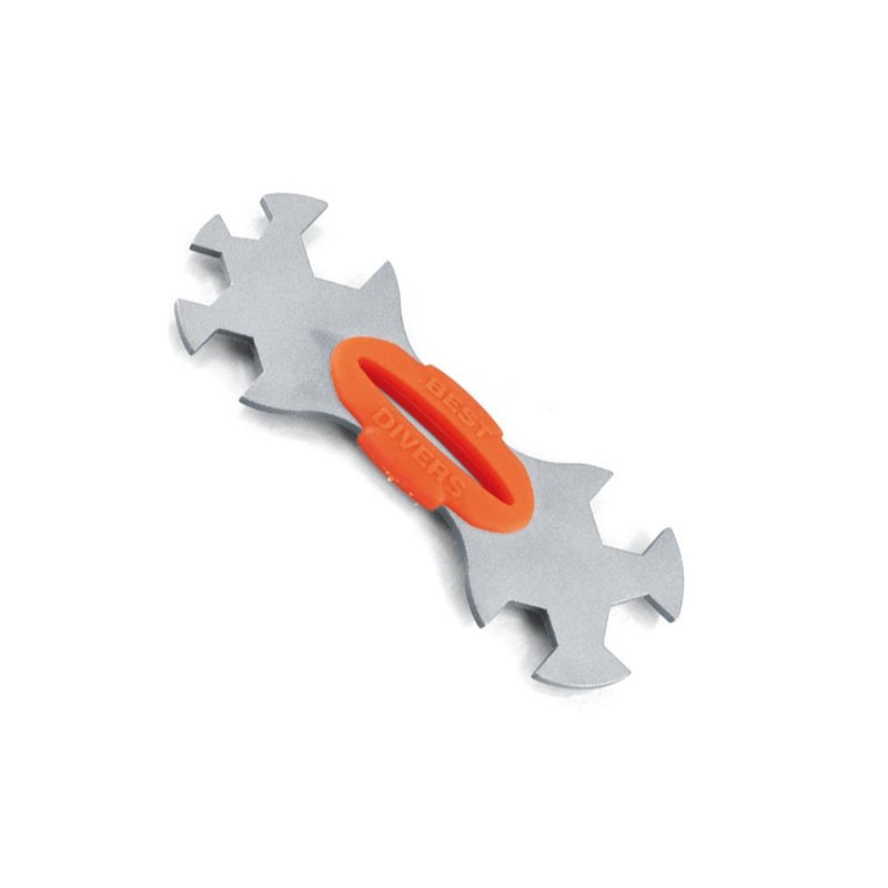 Multi herramientas con distintos pasos de llave todo en una. Perfecta para llevar encima, poder cubrir casi todas las medidas de llave fija que hay en nuestros equipos de buceo y ocupar el mínimo espacio posible.