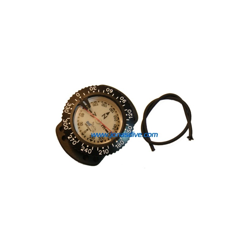 Brújula BtS montada en cápsula con gomas para la sujección a la muñeca (bungee mount). Este tipo de montaje hace que sea muy sencillo el ponerse y quitarse el instrumento, además de eliminar la posibilidad de perdida por el hipotético hecho de que se suelte un pasador.