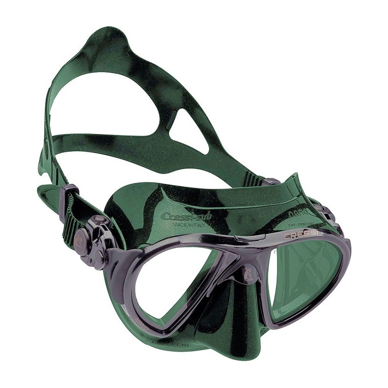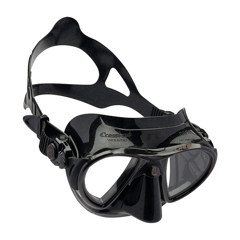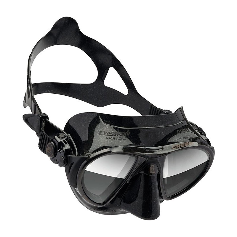 El montaje de la máscara es radial (no axial); la montura, dividida en dos partes que se unen mediante un clip, rodea al cristal a modo de abrazadera. Este sistema mejora la estanqueidad de la máscara, anula cualquier posibilidad de contacto incómodo de la montura con la frente y elimina toda visión de la zona central del marco desde el interior. Su facial optimiza los espacios muertos y reduce el volumen interno hasta sólo 85 cm³. La distancia cristal/cara se ha reducido hasta tal extremo que el facial no llega a hacer el conocido efecto ventosa, simplemente se asienta sobre la cara proporcionando una óptima estanqueidad gracias a su diseño y a la estudiadísima relación espesor/nivel de rigidez de la silicona. Cristales inclinados que se prolongan mediante suaves líneas curvas por encima de los pómulos, mejorando la visibilidad inferior. La finísima montura y el estudiado acople con la delicada zona del hueso frontal optimizan la visibilidad superior sin perjudicar la capacidad de adaptación. Las hebillas, ancladas en la montura para una óptima estabilidad de la máscara y una tensión siempre a determinar por el usuario, son completamente plegables y basculantes en todos los sentidos. Por lo tanto la posibilidad de rotura es casi imposible. Este tipo de anclaje mejora también la estabilidad de la máscara, ya que la tensión de la tira se produce sobre un elemento rígido y los movimientos del tubo no afectan al facial.