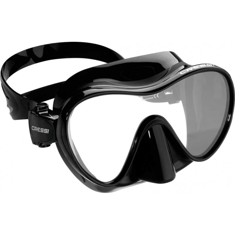 F1 es una moderna máscara monocristal derivada del modelo PIUMA con diseño especialmente elegante y armonioso y tecnología frameless. Los acabados de la silicona, extremadamente brillantes, le confieren un atractivo look potenciado por una inaudita gama de colores. El facial de silicona se ensambla directamente sobre el cristal sin necesidad de montura. Este sistema garantiza una buena visibilidad en todas direcciones, en especial hacia los laterales ya que permite un máximo acercamiento ojo/cristal sin molestas presiones en la frente o zona parte superior de la nariz. El facial es muy polivalente para todo tipo de fisonomías y ofrece un elevado confort incluso con utilización muy prolongada. El calculado diseño de los espacios interiores combinado con la calibrada flexibilidad del facial, variable dependiendo de la zona, proporcionan una gran estabilidad de la máscara unida a un gran confort y polivalencia de adaptación. Las hebillas son completamente basculantes y con regulación inmediata de la tira con una sola mano. El anclaje del sistema de hebillas en la montura evita la deformación del facial de silicona durante el uso de la máscara (propio de los modelos que anclan las hebillas en el propio facial) ya que la tensión de la tira se produce a la altura del cristal, optimizando a gusto del usuario el nivel de proximidad del cristal/ojo y, por lo tanto, el volumen y la visibilidad óptima de la máscara. Es un máscara idónea para uso amateur y deportivo: snorkeling y buceo.