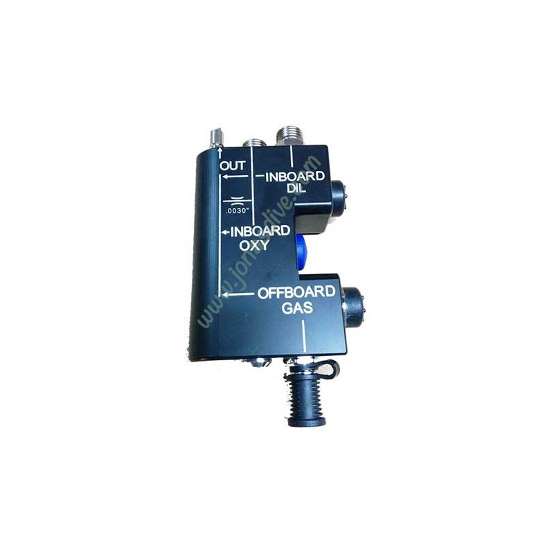 Consola fabricada a partir de un sólido bloque de Delrin. Dispone de tres conexiones de entrada de GAS. Dos conexiones fijas para el GAS on-board (O2 y Diluyente) y una conexión rápida para el GAS off-board.