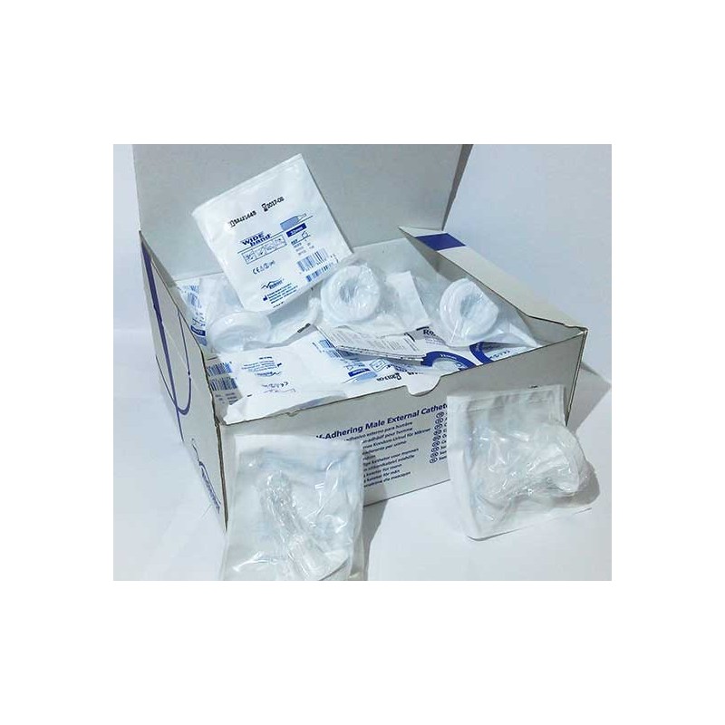 Condones urinarios autoadhesivo en 4 medidas, en caja o unidades sueltas. Indica en el panel desplegable caja completa o unidades sueltas.