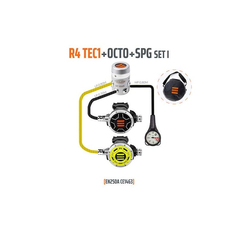 Set compuesto por 1ª etapa Tecline R4 de membrana compensada y cámara estanca, 2ª etapa TEC1 y Octopus TEC1 y manómetro.