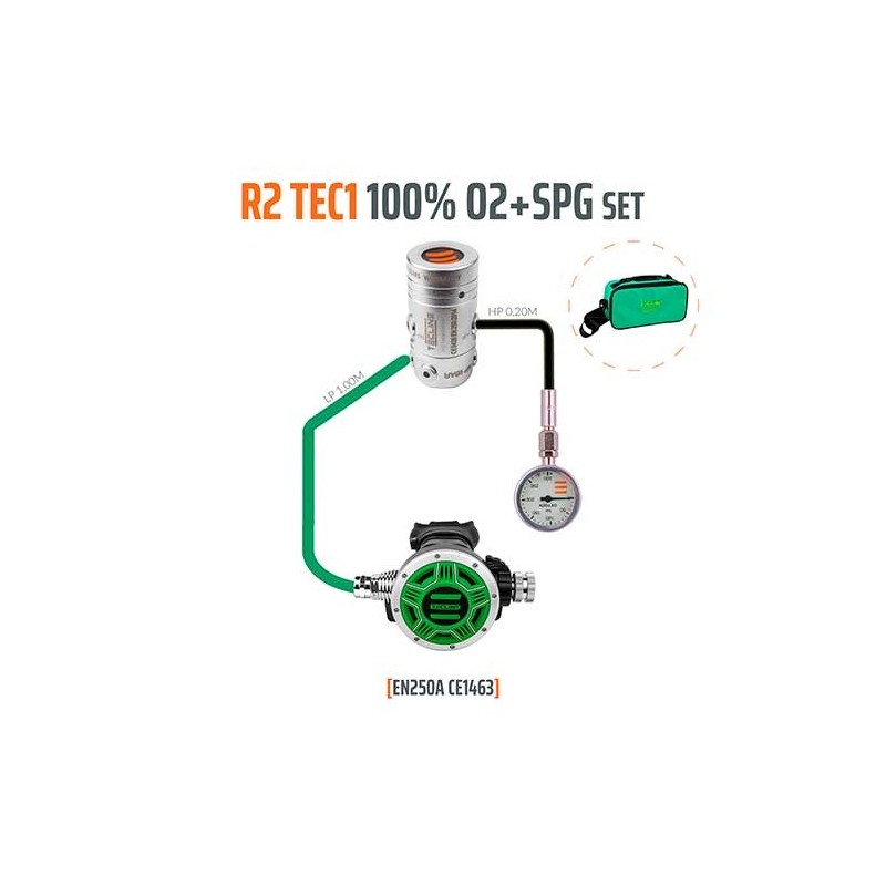 Set compuesto por 1ª etapa Tecline R2 Oxígeno conexión M26x2 de membrana compensada, torreta giratoria y cámara estanca, 2ª etapa TEC1 y manómetro.