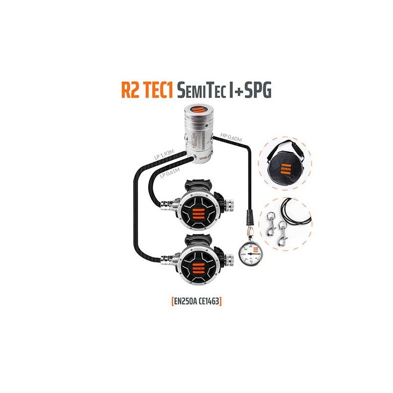 Set compuesto por 1ª etapa Tecline R2 de membrana compensada, torreta giratoria y cámara estanca, dos 2ªs etapas TEC1 y manómetro y mosquetón de 88mm