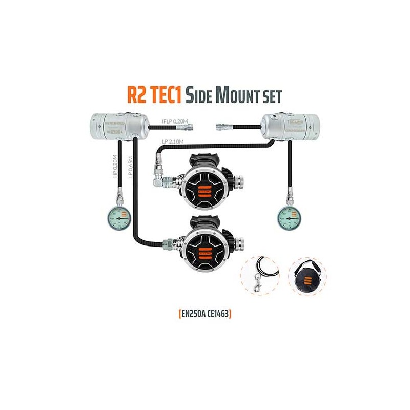 Set específico para Sidemount compuesto por Dos 1ªs etapas Tecline R2 con 5º Puerto de membrana compensada, torreta giratoria y cámara estanca, Dos 2ªs etapas TEC1 y Dos manómetros.