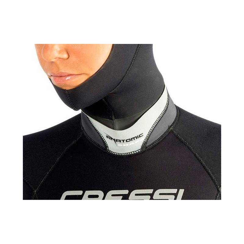 • Cuello en neopreno de 3 mm, con forro interior Ultraspan© y exterior Glide Skin©, para facilitar la colocación del traje y la estanqueidad de esta crítica zona, especialmente en el caso de las buceadoras, con un perímetro de cuello reducido. El patronaje Anatomic Shape prevé el perfil idóneo del cuello respecto del pecho (120º) y evita la opresión en esta zona. Una segunda solapa exterior mejora la estética y la estanqueidad del cuello.