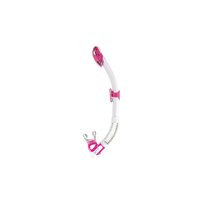 Un tubo con un extremo superior 100 % seco que ofrece un gran confort de respiración gracias al gran volumen de la base. Incluye una fijación deslizante y un tubo ondulado y una boquilla de silicona. Disponible en ocho colores.